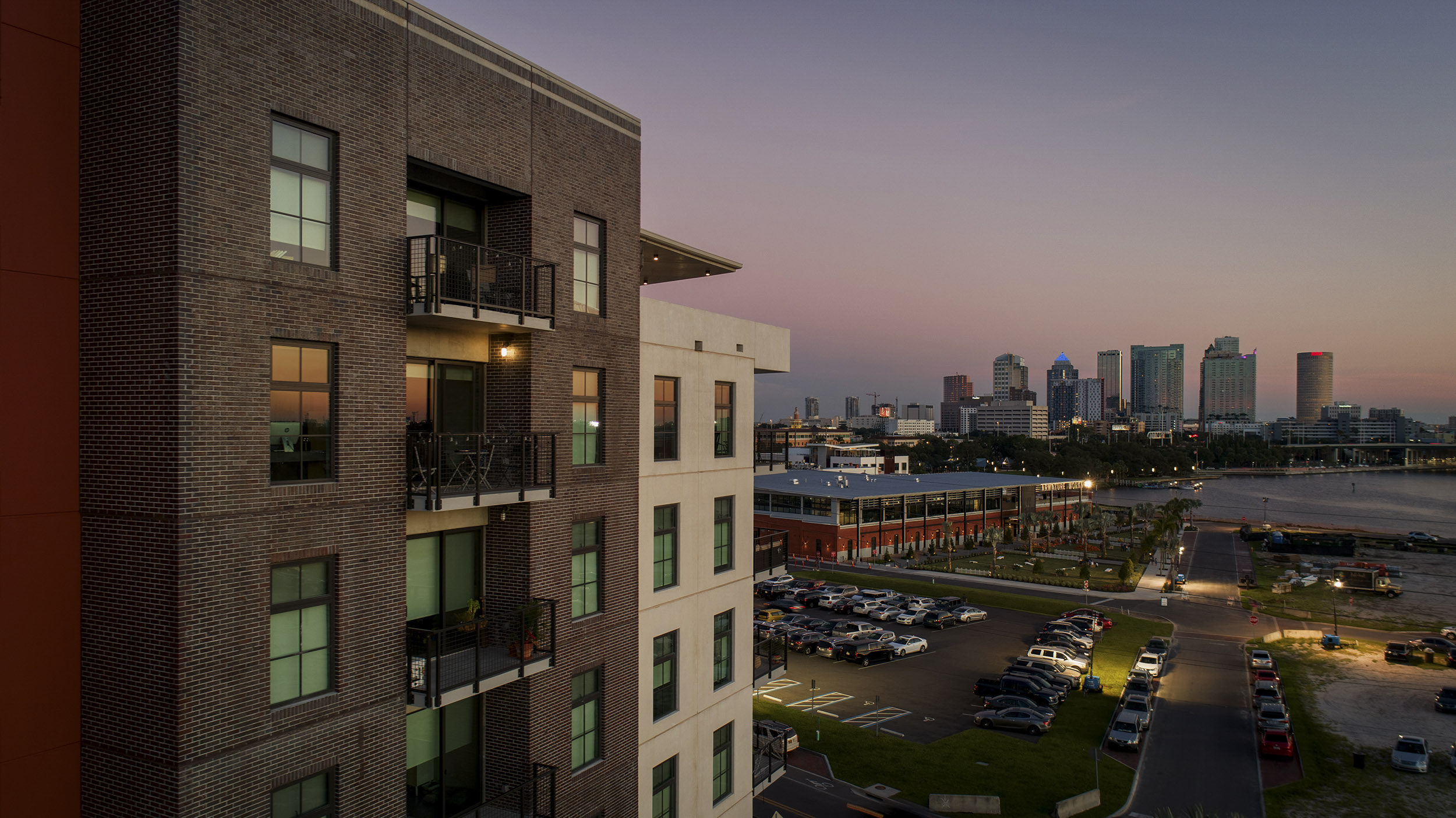 The four five-story residential buildings that make up The Pearl reflect two different approaches to the wrap design. The garage structure abuts hard up against one of the residential buildings and all of the apartments in that building face outward toward a street view. The other four buildings are separated from the garage by a 40-foot-wide landscape buffer that serves as a dog park. Those buildings have apartments that face inward toward the courtyard and landscaped area and apartments that face out with a view of the neighborhood, the Hillsborough River and the Armature Works.