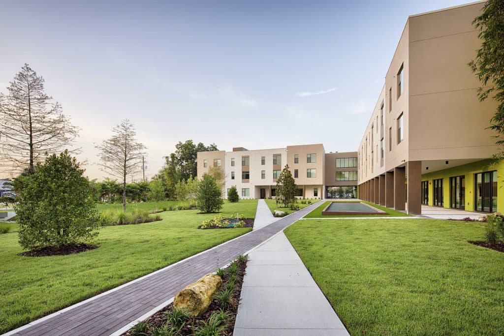 Just a few months before design began, the existing residents were moved out to make way for the major renovation to come. Many hoped they would be able to return to the community they had known for so long. The goals of the design and development teams were to enhance the aesthetics of the building while completely overhauling the building’s major systems. Design workshops included the Tampa Housing Authority board and past residents to ensure many voices were heard. The existing clean modern lines of the structure set the framework, allowing key moves—like new distinctive roof lines—to stand out among the surrounding new development. An updated color palette was selected to complement the existing brick facades. Three dynamic mosaic murals provided an added pop of color and set off the beautiful new look of the exterior. New landscaping, a dog park and walkways with seating and canopies tie together the exterior spaces and create connections to rejuvenated interior gathering spaces. A renovated community room, dining room, theater, fitness center and business center allow for many updated options for social life among residents.