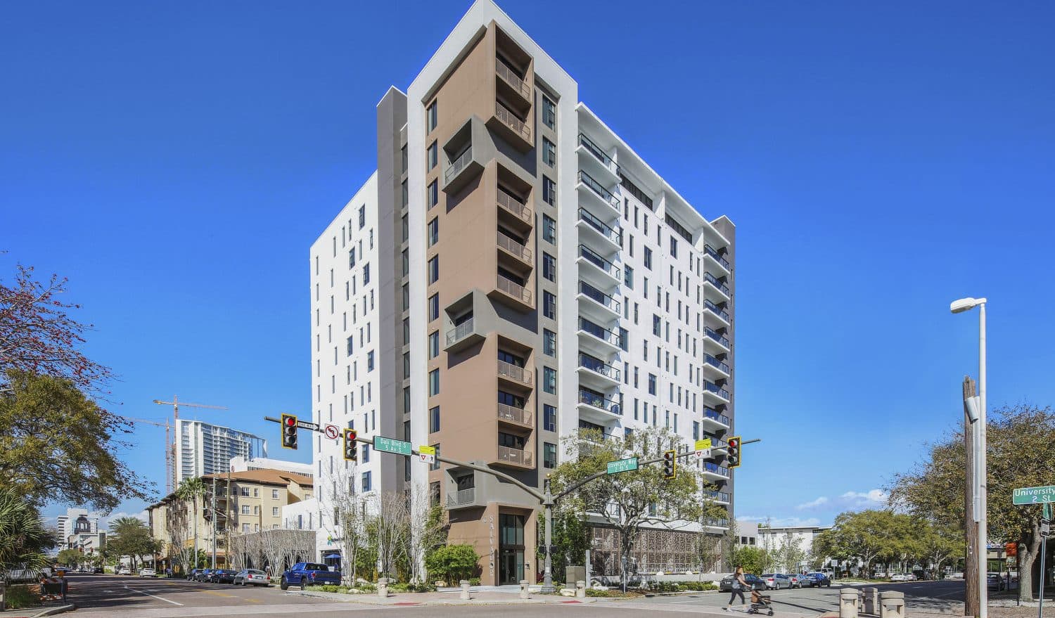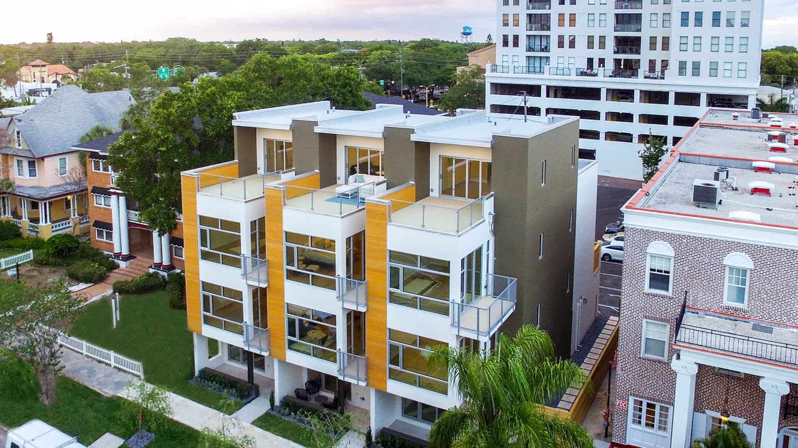 Urbana is a new, fee-simple, townhome project located in a desirable area of downtown St. Petersburg. The first floor of each of the five 1,640 square foot homes contains the main living spaces opening onto a private patio. The three bedrooms on the second and third floors are flexibly designed allowing for a variety of living arrangements. A north facing roof terrace on the third floor provides a shaded spot to enjoy views of the downtown skyline. The compositional strategy was "nested boxes" and consists of interlocking and cantilevered cubic volumes of various sizes.